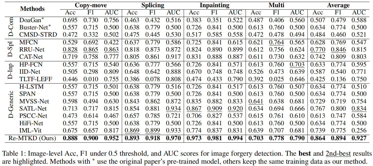 - 我们提出了一种强化多教师知识蒸馏(Re-MTKD)框架,该框架由ConvNeXt-UPerNet结构和一种新颖的边缘感知模块(EAM)组成,该模块融合了低级和高级特征,显著增强了检测篡改痕迹的能力。
